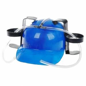 Синяя пластиковая каска с двумя держателями для банок или небольших бутылок и трубкой, через которую можно пить, поможет Вам утолить жажду во время движения, не останавливаясь и не занимая рук. Трубка имеет зажим, благодаря которому можно регулировать напор жидкости, и две соединительные трубочки, с помощью которых можно смешивать два различных напитка в виде коктейля. Каска имеет амортизатор, регулирующий глубину посадки каски.